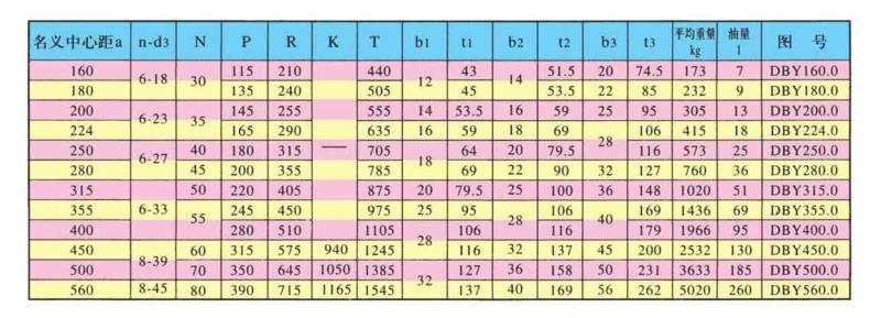 DBY、DBYK、DBZ型減速機(jī)各有12種規(guī)格,名義中心距為:160,180,200,224,250,280,315,355,400,450,500,560mm每種規(guī)格均有5種傳動(dòng)比(8,10,11.2,12.5,14)兩種旋向,四種裝配型式,分別組成240種減速機(jī)。